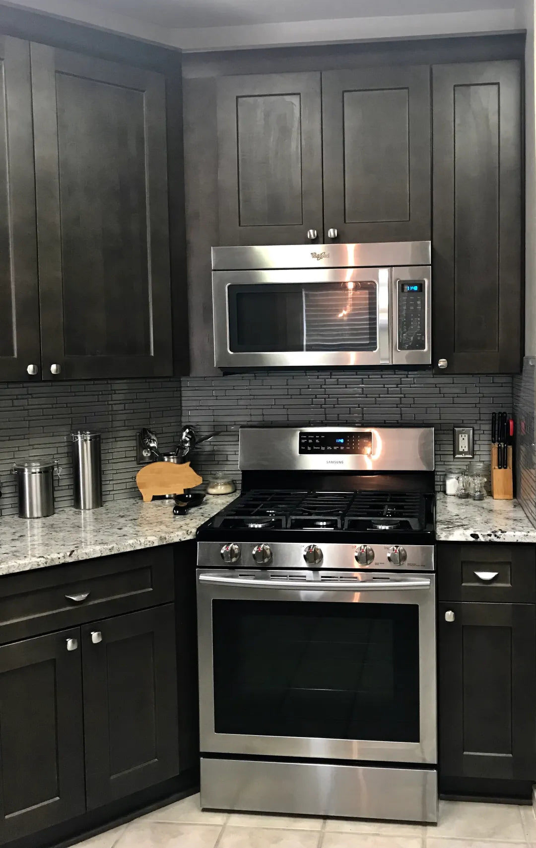 Charcoal Gray stain is available with Shaker style doors in any cabinet configuration.